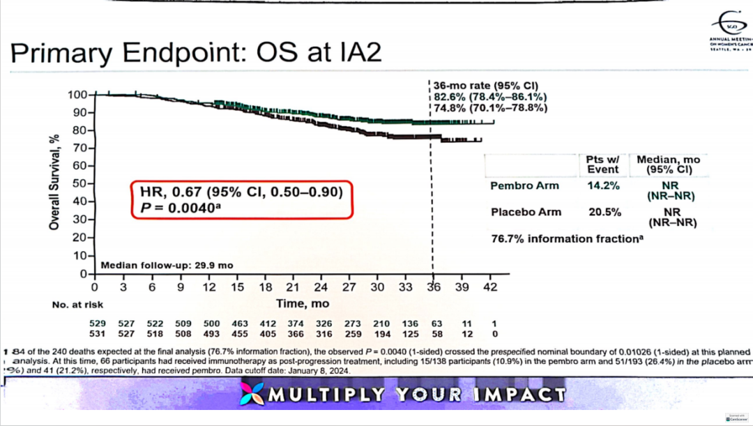 截至2024年1月8日,中位随访时间29.9个月(范围12.8-43.0)。结果显示,帕博利珠单抗联合CCRT组显示出显著的OS改善,36个月OS率为82.6%vs 74.8%,两组中位OS均未达到(HR 0.67,95%CI 0.50-0.90,P=0.0040)。OS获益在各预设亚组中基本一致,包括FIGO IB2-IIB期(HR 0.89,95%CI 0.55-1.44)和III-IVA期(HR 0.57,95%CI 0.39-0.83)。