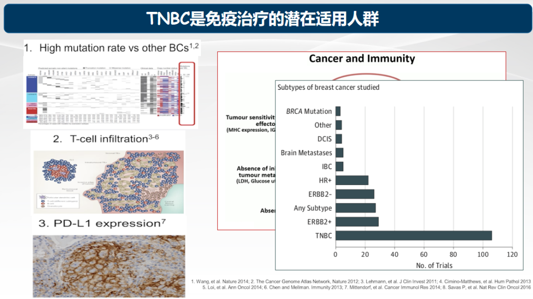 在免疫治疗的发展历程中,肺癌、黑色素瘤等癌种率先取得了显著突破。相比之下,乳腺癌的免疫治疗曾一度进展缓慢。这主要归因于乳腺癌自身的特点,其肿瘤突变负荷较低,属于中弱免疫原性癌种,免疫系统难以有效识别和攻击癌细胞。