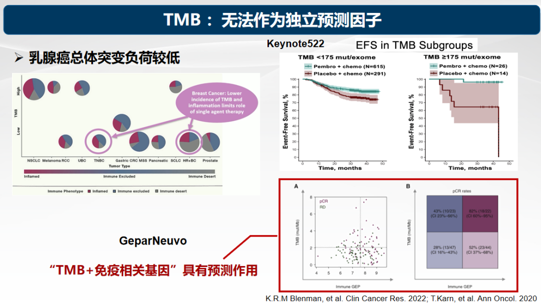 以PD-L1表达为例,在KEYNOTE-522研究中,即使PD-L1综合评分(CPS)<1的患者,依然能从帕博利珠单抗治疗中获益,这表明PD-L1并非独立可靠的预测因子。TIL虽然与免疫治疗疗效有一定相关性,但其检测的标准化问题尚未得到很好解决,影响了其预测价值。而乳腺癌整体突变负荷相对较低,TMB在乳腺癌免疫治疗中的作用也较为有限。