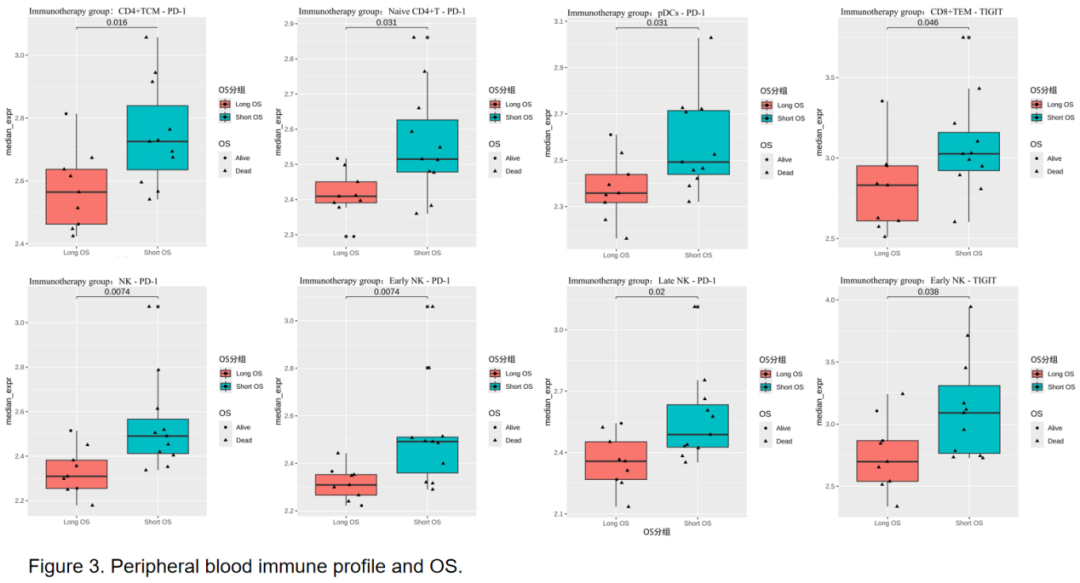 此外,多个细胞亚群的基线PD-1(CD4+TCM,P=0.016;Naive CD4+T,P=0.031;pDCs,P=0.031;NK,P=0.007;Early NK,P=0.007;Late NK,P=0.02)与TIGIT(CD8+TEM,P=0.046;NK,P=0.038)表达水平与OS呈显著负相关。