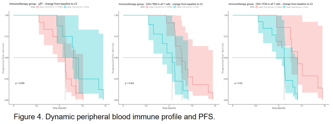 外周血动态监测显示,在免疫治疗组中,治疗后γδT细胞占比增加(PFS,P=0.035;OS,P=0.032)与较长的PFS和OS显著相关。治疗后CD4+TEM(PFS,P=0.021;OS,P=0.036)和CD4+TCM(PFS,P=0.01;OS,P=0.014)占比增加与较短的PFS和OS显著相关。