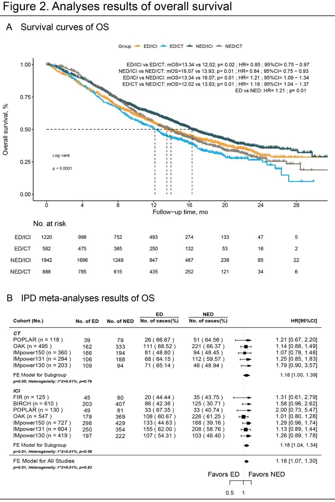 排除了无进展生存期不为主要结局的临床试验,并在初治临床试验中进一步研究了情绪困扰与无进展生存期的关系。Kaplan-Meier分析表明,不论免疫检查点抑制剂(中位PFS分别为5.52个月与5.58个月;p=0.01;HR=1.19[1.06-1.33])还是化疗(中位PFS分别为5.55个月与5.59个月;p=0.06;HR=1.17[0.99-1.37]),情绪困扰患者的无进展生存期较差。IPD荟萃分析也支持了上述结果(HR=1.15[1.03-1.28],p=0.02)。