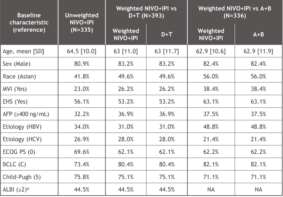 151P Matching-adjusted indirect comparisons(MAICs)of nivolumab+ipilimumab(N+I)vs durvalumab+tremelimumab(D+T)and atezolizumab+bevacizumab(A+B)for first-line(1L)unresectable hepatocellular carcinoma(uHCC)Kudo,M.et al.Annals of Oncology,Volume 36,S64