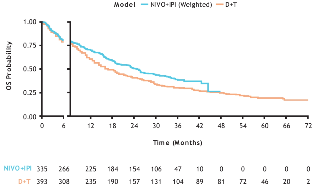 安全性方面(表3),N+I加权后的≥3级治疗相关不良事件(TRAEs)发生高于D+T(25.8%),但低于A+B(43.5%),治疗相关死亡率与两者相当。