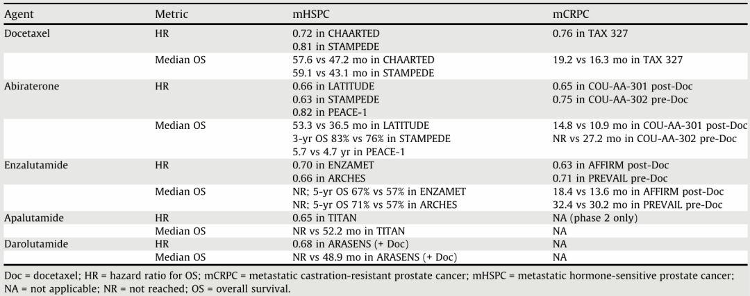 近十年来,随着多项新型疗法及其联合方案的临床研究与实践应用,治疗策略日益丰富。基于循证医学证据的延伸策略,当某种药物在预后更差的转移性去势抵抗性前列腺癌(mCRPC)人群中证实可显著延长总生存期(OS)时,该药物通常会被纳入mHSPC的治疗探索;值得注意的是,后续研究普遍显示此类药物在mHSPC患者群体中能产生更为突出的临床获益。这一规律率先由化疗药物多西他赛的研究数据所验证,继而在雄激素受体通路抑制剂(ARPI)阿比特龙、阿帕他胺、恩扎卢胺和达罗他胺的临床试验中得到进一步确证。