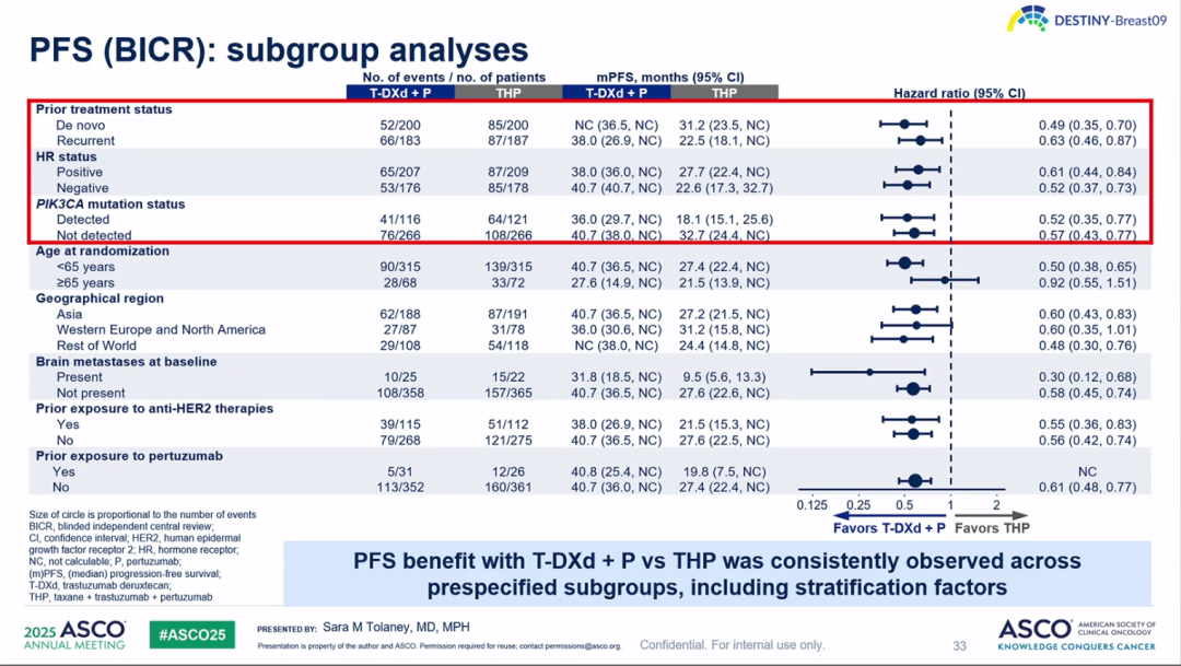 值得一提的是,DESTINY-Breast09研究在方案设计阶段即前瞻性地预设了初诊晚期和复发晚期、HR阳性与HR阴性、PIK3CAm与非PIK3CAm三个关键因素作为随机化分层因素。此举不仅能够有效控制潜在的偏倚,也为后续开展科学、可靠的亚组分析奠定了坚实的基础,从而为个体化诊疗策略制定提供了更为真实、客观的循证依据。