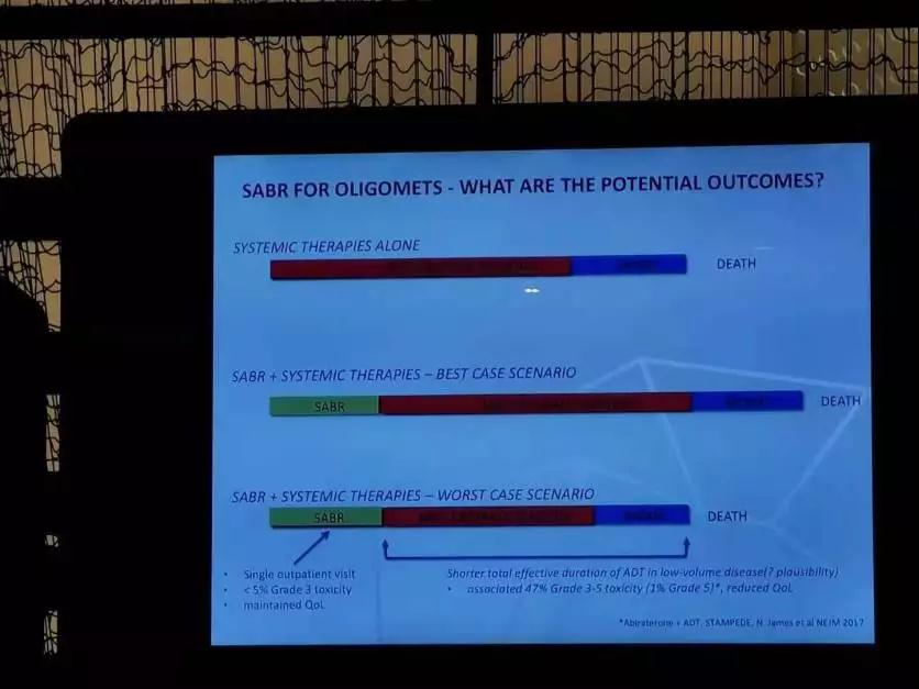 相较于全身系统治疗而言,局部治疗的生存获益价值虽然无法完胜前者,但后者在生活质量方面的优势是有目共睹的。在这方面,放疗和手术的优化都是在时间——局部做加法、全身做减法。放疗提倡多时间、高精准度,手术提倡微创、精准操作,两方面都在减少3级以上副作用,使得患者能够尽可能维持较长的正常生活。实际上,在他们的经验中,寡转移前列腺癌是可以参照早期前列腺癌——治疗一小部分aggressive cancer,而surveil(监视,观测)另一部分indolent cancer(惰性肿瘤),这样就避免了内分泌治疗的副作用(实际上对于人体有相当的影响)。