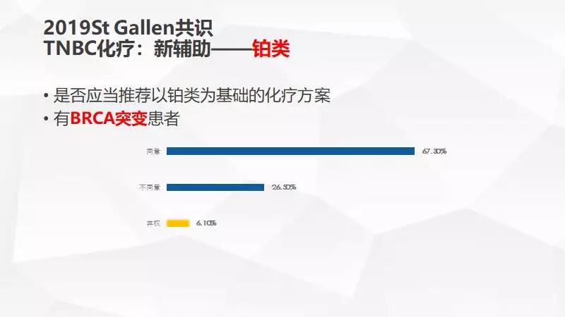 来来,既然如此,我们不妨放下手中的瓜,冷静反思一下:2019年67.3%的St.Gallen专家同意对BRCA突变TNBC患者进行含铂方案进行新辅助化疗是否略显仓促(见图3)?