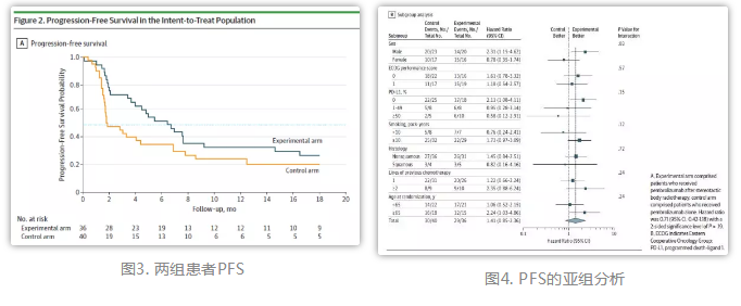 实验组和对照组的PFS分别为6.6个月(95%CI: 4.0-14.6个月)和1.9个月(95%CI: 1.7-6.9个月),但差异无统计学意义(HR=0.71; 95% CI: 0.42-1.18; P=0.19)(图3)。亚组分析发现,PD-L1表达阴性患者PFS获益更加明显(HR=0.49; 95% CI: 0.26-0.94, P=0.03),而PD-L1表达阳性患者未观察到这一获益(HR=1.14; 95% CI: 0.45-2.89; P=0.79)(图4)。