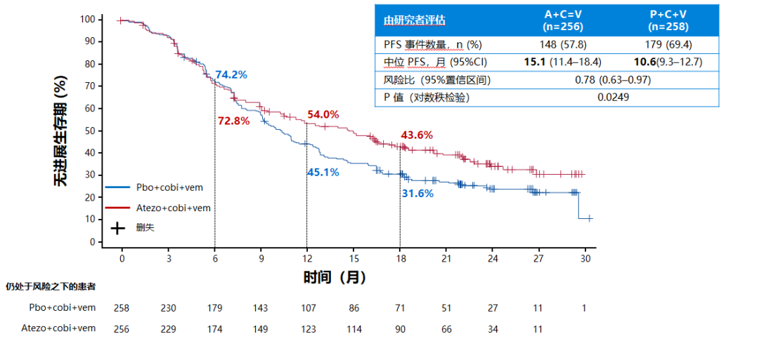 设计:IMspire150研究(III期)入组了514例晚期BRAF-V600突变的黑色素瘤患者,随机分成V+C+A和V+C+P(V:维莫非尼,C:考比替尼,A:阿替利珠单抗,P:安慰剂),前4周为靶向导入期,4周后加入A或者P,V较常规剂量有所减量(见下图)。研究终点为PFS。