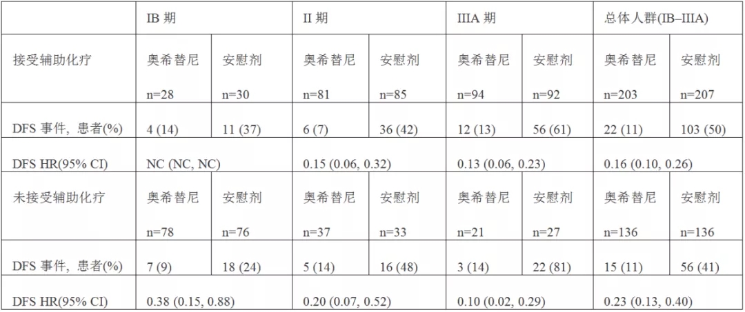 重要的是,无论NSCLC患者是否接受辅助化疗,奥希替尼组患者的DFS始终优于安慰剂组: