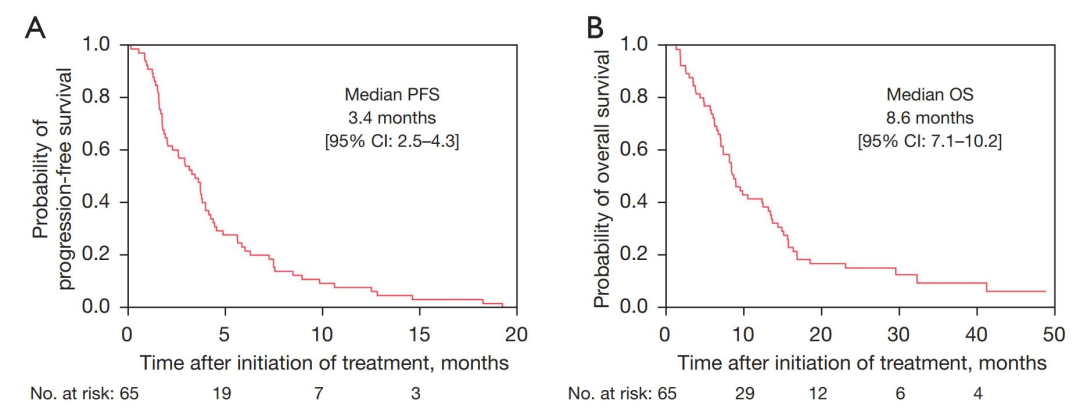 最终,共计65例患者入组,77%的患者为男性,中位年龄69岁,66%的患者诊断为腺癌,分别有63.1%和36.9%的患者在二线和三线接受白蛋白结合型紫杉醇治疗。全组患者ORR和DCR分别为18.5%和61.5%,中位PFS和OS分别为3.4个月和8.6个月。鳞癌患者以及既往接受过吉西他滨治疗的患者,具有较好的PFS (P=0.0346)和更好的OS (P=0.0235)。从安全性看,治疗相关的3度及以上血液学不良反应包括中性粒细胞下降30.8%、淋巴细胞下降23.1%、贫血1.5%;非血液学3度及以上治疗相关不良反应包括感染7.7%、低钠血症4.6%、ALT升高1.5%及乏力1.5%。6.2%的患者出现粒细胞缺乏性发热。