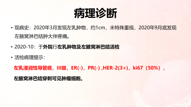 王殊教授:如果可以取到全面的病理结果更好,但是理论上来说,ER(-)、PR(-)、HER2(3+)患者发生转移的异质性更弱。我认为不一定从最开始就要取所有病灶的病理结果。但是由于这个患者临床实际的情况偏离了我们的预期,所以我建议复核病理。另外,随着影像学的进步,PET-CT可以利用一些靶向标定的示踪剂帮助医生判断ER、PR、HER2的表达情况,给予患者无创评估的机会。
